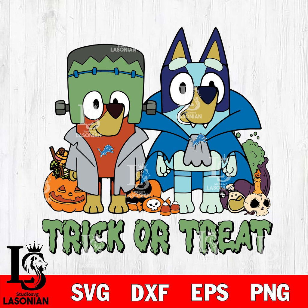 Plus, you can print these designs on a wide range of surfaces such as mugs, t-shirts, tumblers, flags, and more. Unleash your creativity and personalize your world with Detroit Lions Bluey Halloween Trick or Treat