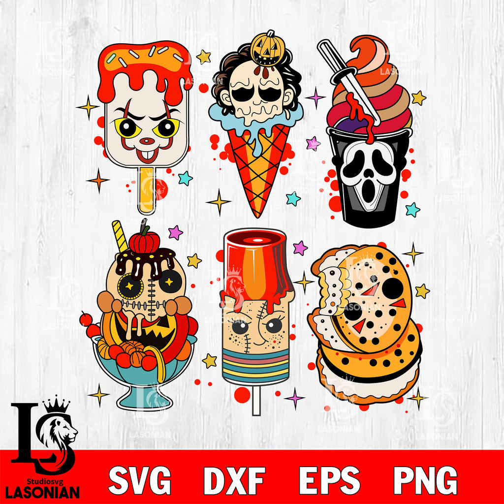 Plus, you can print these designs on a wide range of surfaces such as mugs, t-shirts, tumblers, flags, and more. Unleash your creativity and personalize your world with Ice Cream Horror Characters Halloween