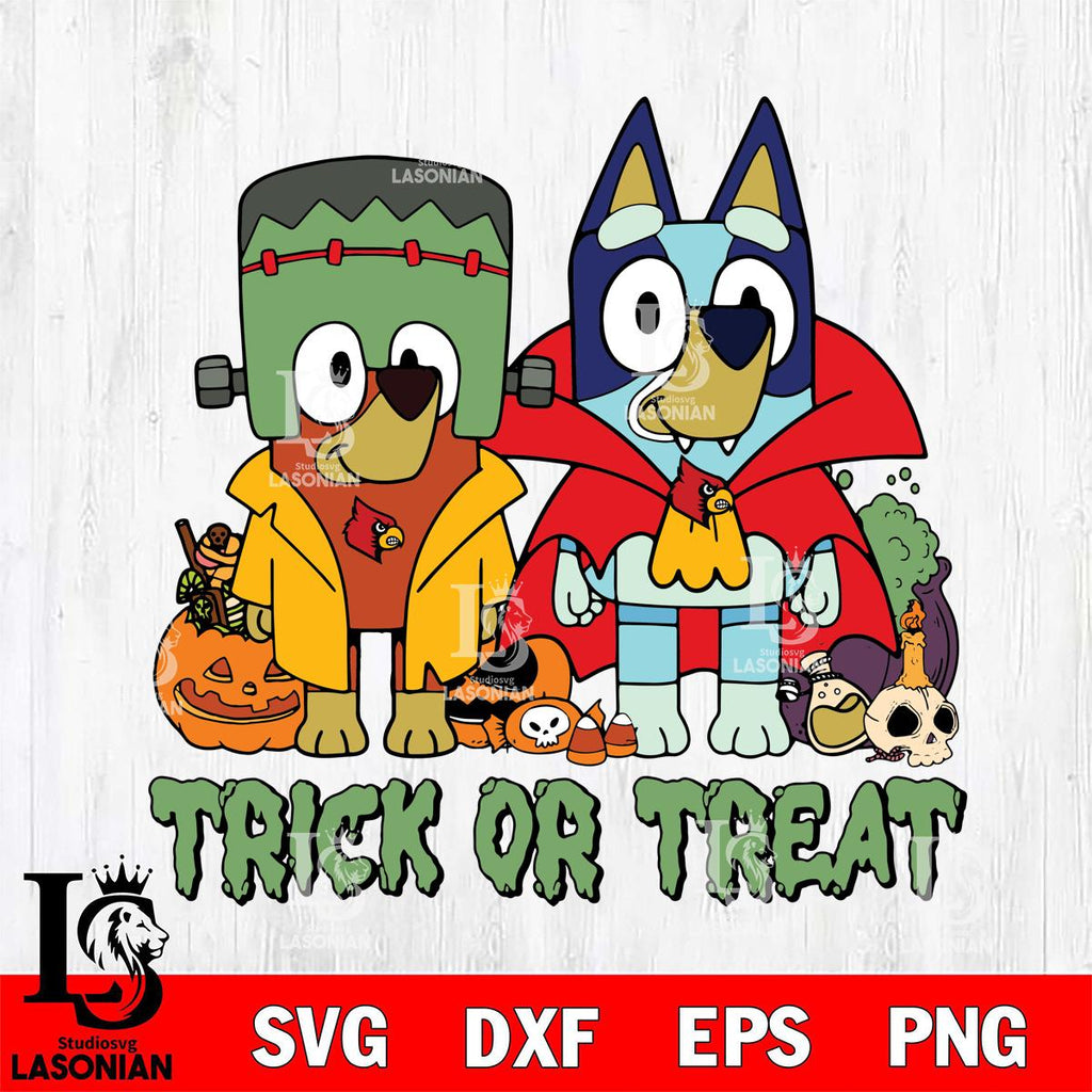 Plus, you can print these designs on a wide range of surfaces such as mugs, t-shirts, tumblers, flags, and more. Unleash your creativity and personalize your world with Louisville Cardinals Bluey Halloween Trick or Treat