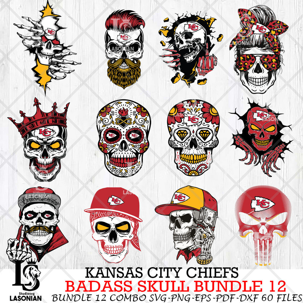 ►With the Kansas City Chiefs Badass Skull Bundle SVG, you can let your creativity run wild. This INSTANT DOWNLOAD package includes a ZIP folder containing the following: