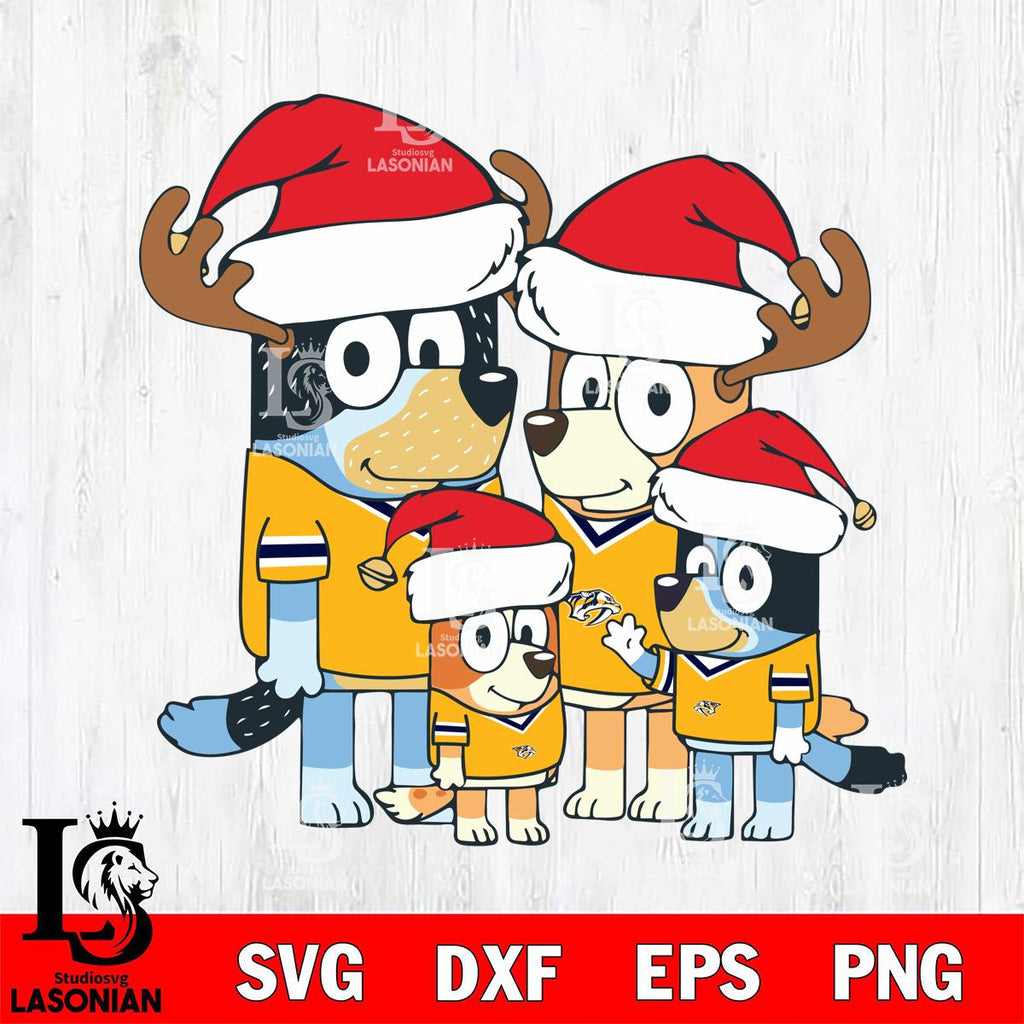 Plus, you can print these designs on a wide range of surfaces such as mugs, t-shirts, tumblers, flags, and more. Unleash your creativity and personalize your world with Nashville Predators Bluey Santa Family