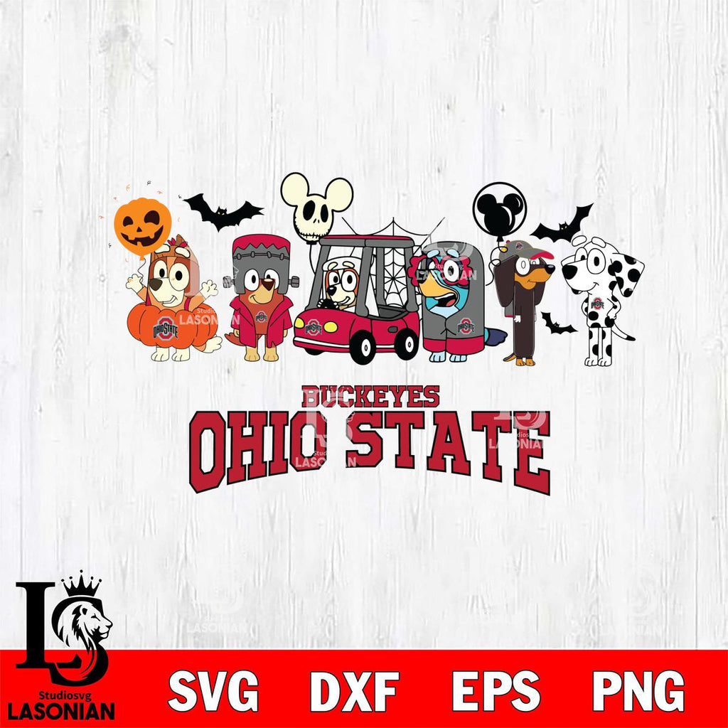 Plus, you can print these designs on a wide range of surfaces such as mugs, t-shirts, tumblers, flags, and more. Unleash your creativity and personalize your world with Ohio State Buckeyes Bluey Halloween
