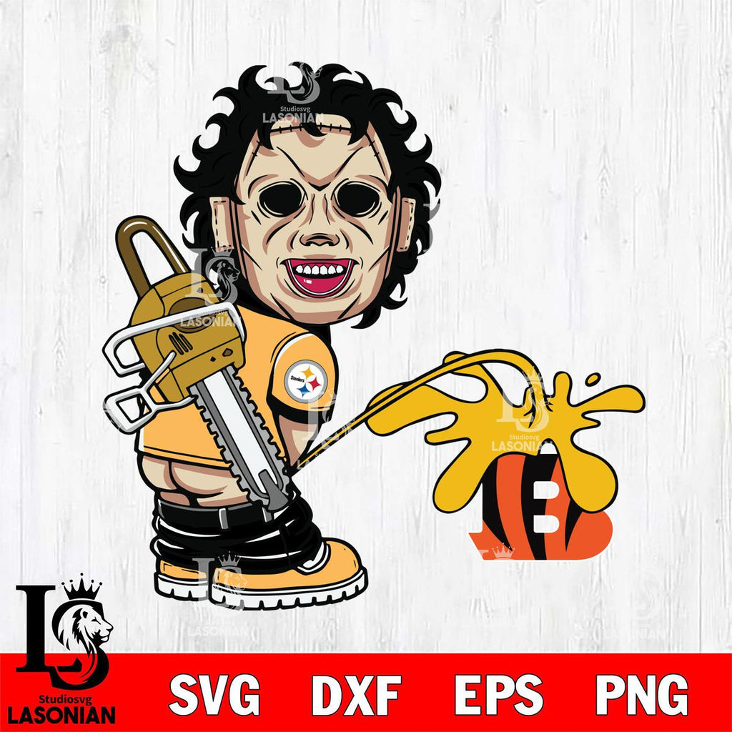 ►With the Pittsburgh Steelers Leatherface Piss On Cincinnati Bengals, you can let your creativity run wild. This INSTANT DOWNLOAD package includes a ZIP folder containing the following: