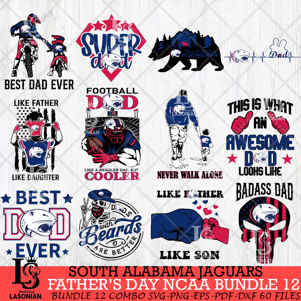 ►With the South Alabama Jaguars Fathers Day NCAA Bundle 12, you can let your creativity run wild. This INSTANT DOWNLOAD package includes a ZIP folder containing the following: