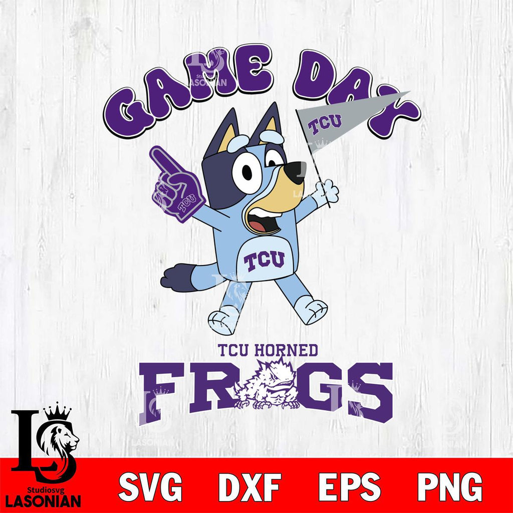 Plus, you can print these designs on a wide range of surfaces such as mugs, t-shirts, tumblers, flags, and more. Unleash your creativity and personalize your world with TCU Horned Frogs Bluey Game Day