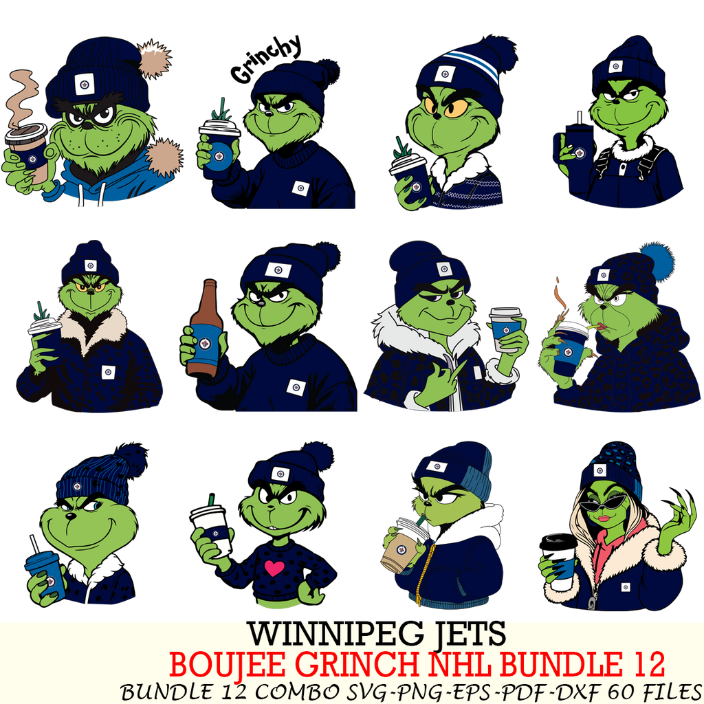 Plus, you can print these designs on a wide range of surfaces such as mugs, t-shirts, tumblers, flags, and more. Unleash your creativity and personalize your world with Winnipeg Jets Boujee Grinch NHL Bundle 12 SVG